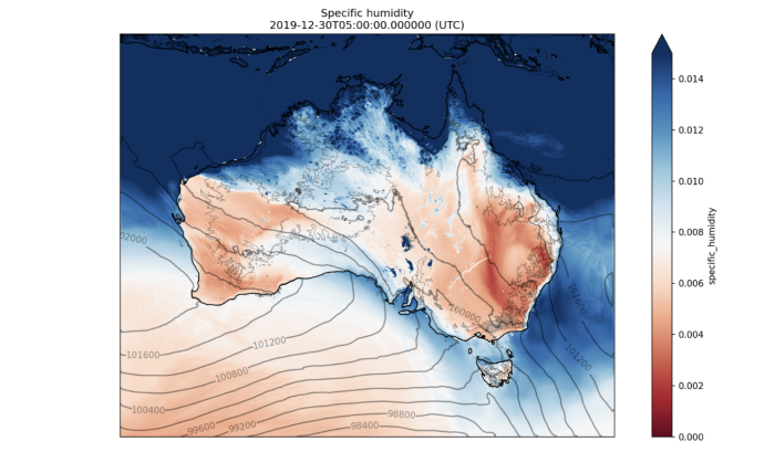 Figure 1: Surface specific humidity derived from the high-resolution simulations on 30th Dec 2019 at 3:00 pm AEST. The red band over the eastern Australia is probably influential in how the fires that occurred in this region behaved.
